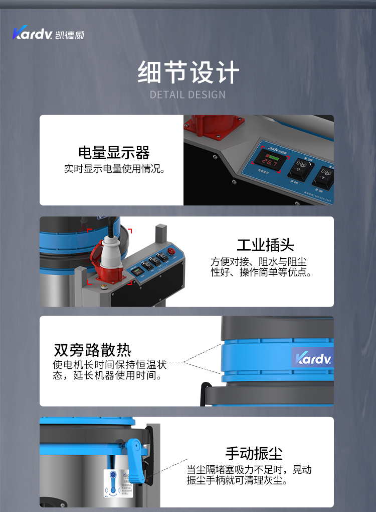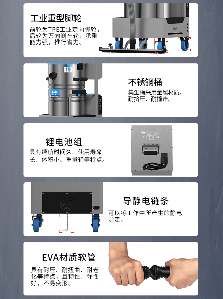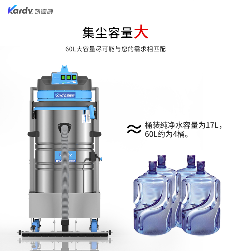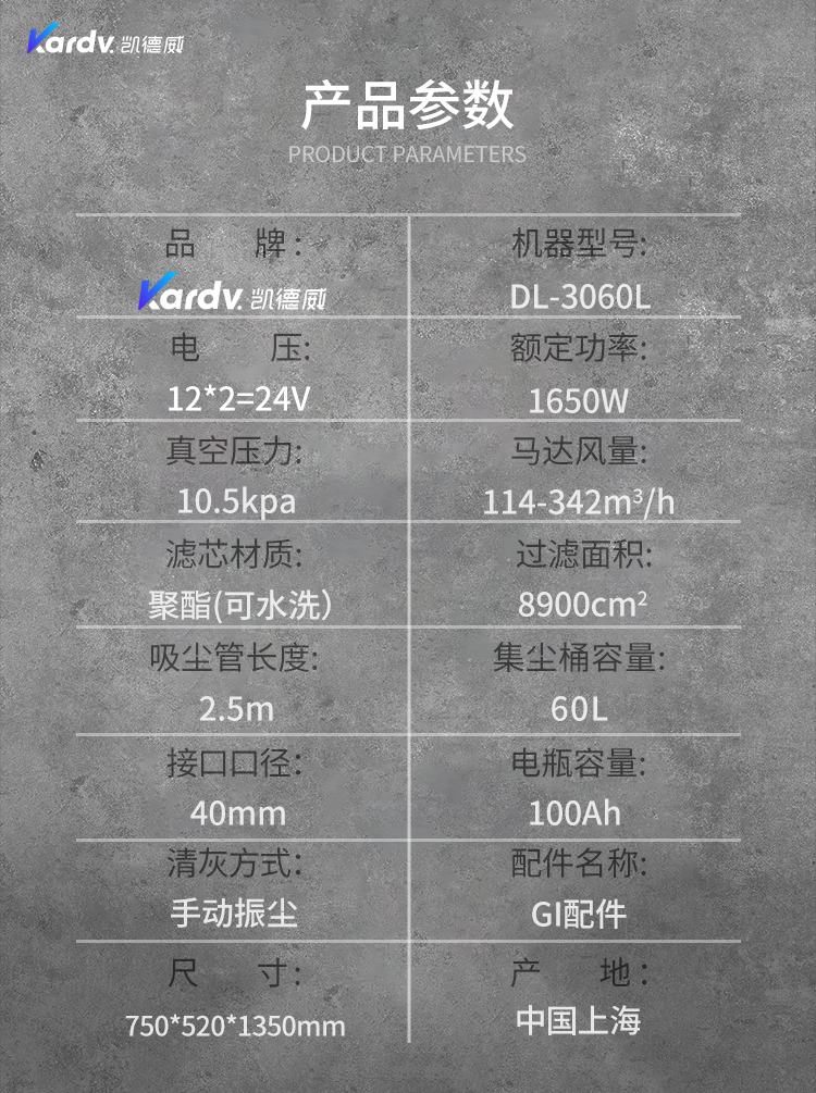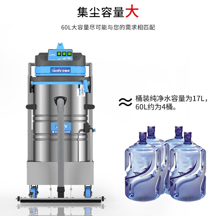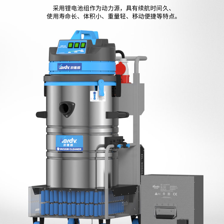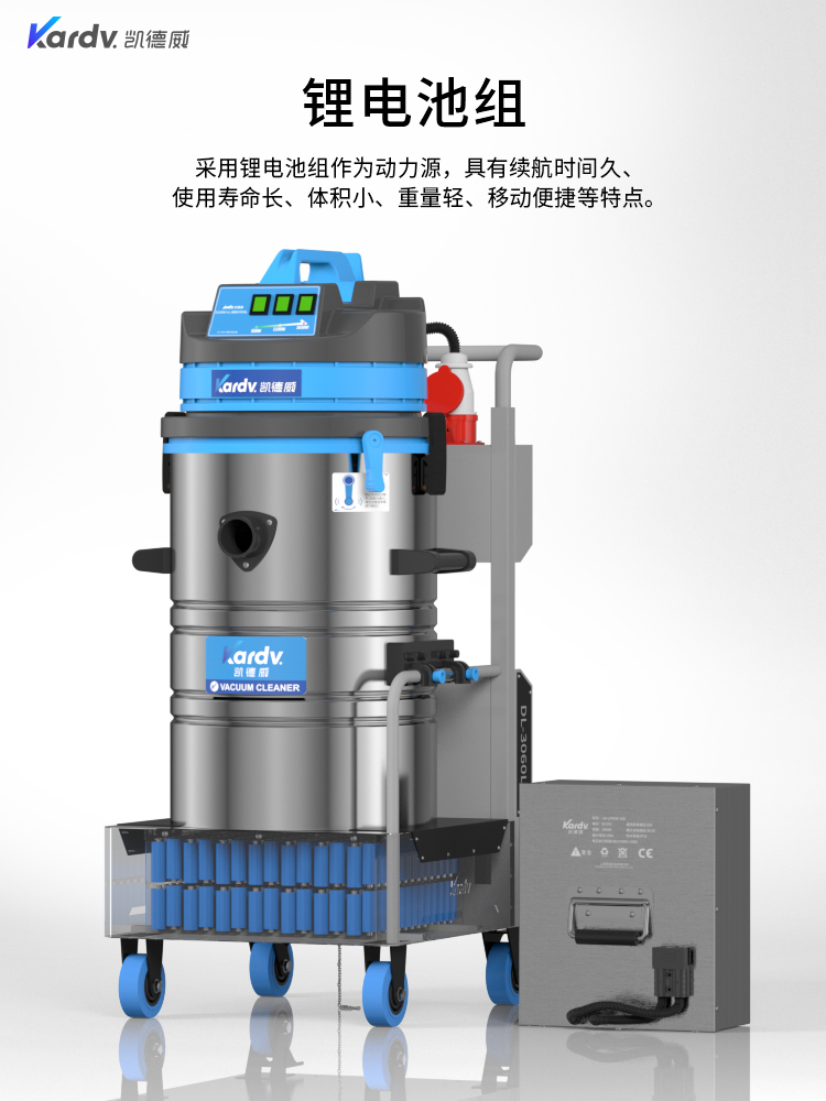 DL-3060L凱德威鋰電池吸塵器是我司的一款充電式工業(yè)吸塵器,摒棄了常規(guī)拖線式吸塵器使用范圍的局限性。此款吸塵器利用鋰電池組做為電力源,不需外接電源,操作簡單方便。體積小,重量輕,移動(dòng)便捷,續(xù)航時(shí)間久,隨充隨用,簡單方便。機(jī)器除常規(guī)手持式吸塵外,裝置有60cm寬可推吸扒頭,可以邊推邊吸。