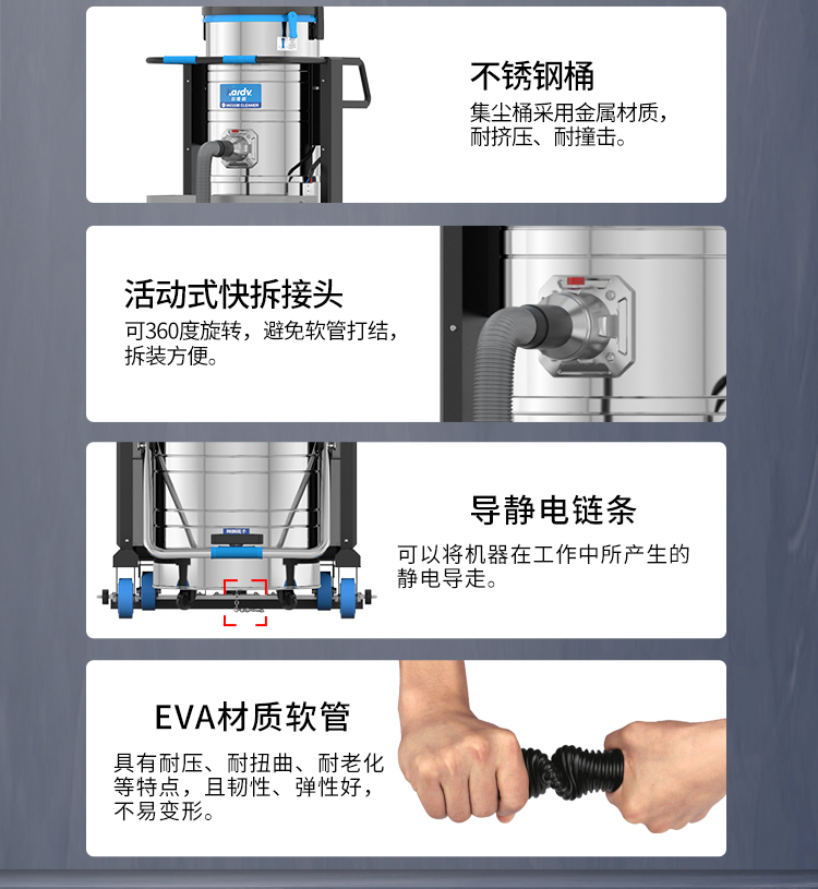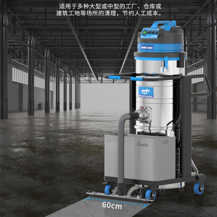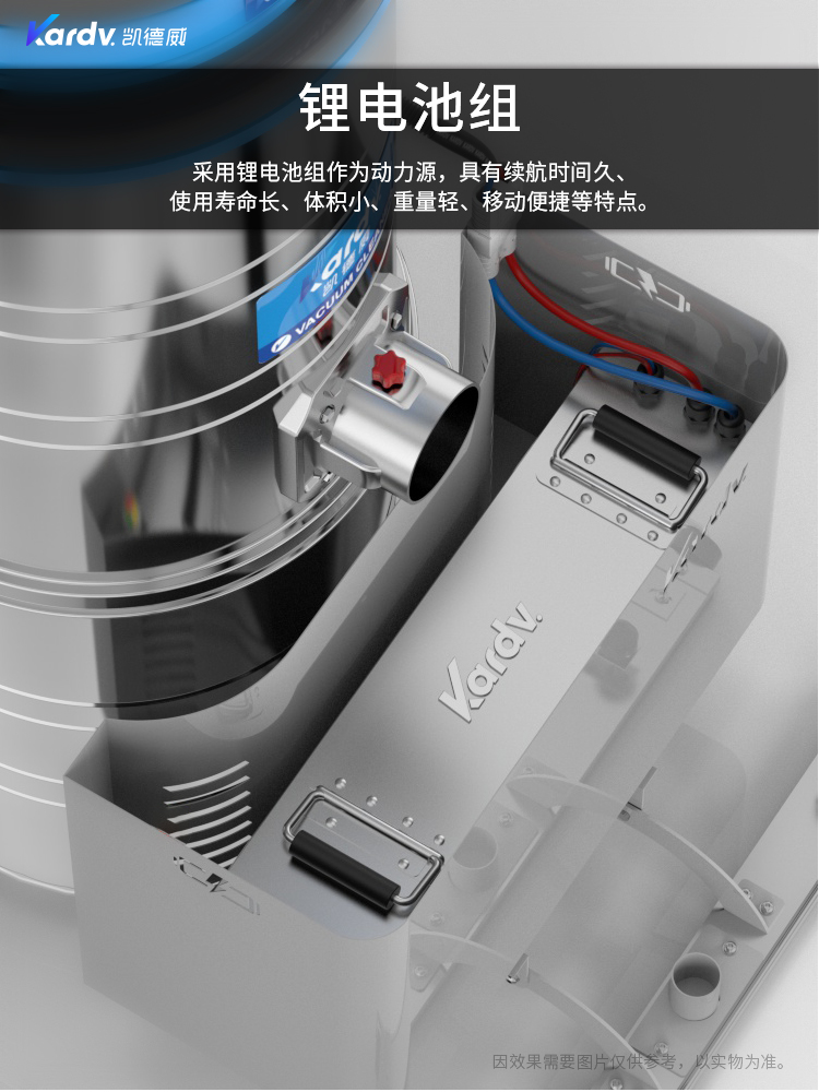 DL-3010L凱德威鋰電池吸塵器是我司的一款充電式工業(yè)吸塵器,摒棄了常規(guī)拖線式吸塵器使用范圍的局限性。此款吸塵器利用鋰電池組做為電力源,不需外接電源,操作簡(jiǎn)單方便。100L不銹鋼集塵桶采用上下分離式設(shè)計(jì),桶壁光滑易清理,分離桶上配有不銹鋼拉桿,移動(dòng)、傾倒垃圾時(shí)方便,移動(dòng)便捷,續(xù)航時(shí)間久,隨充隨用,簡(jiǎn)單方便。機(jī)器除常規(guī)手持式吸塵外,裝置有60cm寬可推吸扒頭,可以邊推邊吸,用于大面積地面除塵。