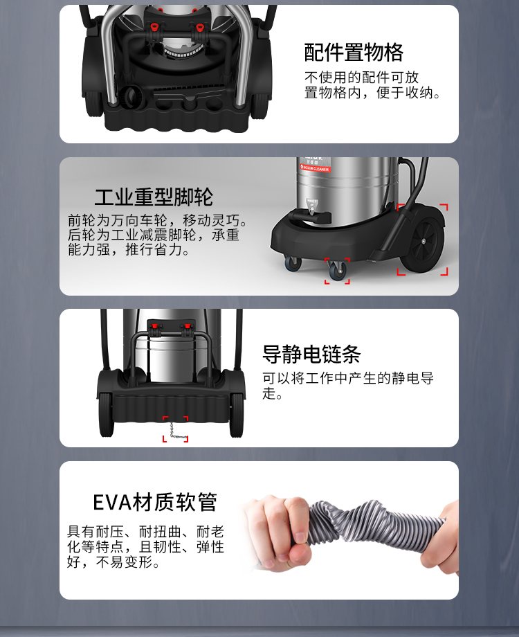 GS-3078S是一款工業(yè)型吸塵器,集塵桶為80L,為不銹鋼材質,配有車架,在移動時輕巧方便,車架底座為PP材質,底座上有置物格,可放置配件或工具方便收納和使用;可以用在工廠、倉庫或建筑工地等場所清理灰塵等,在商業(yè)環(huán)境中也可以使用。