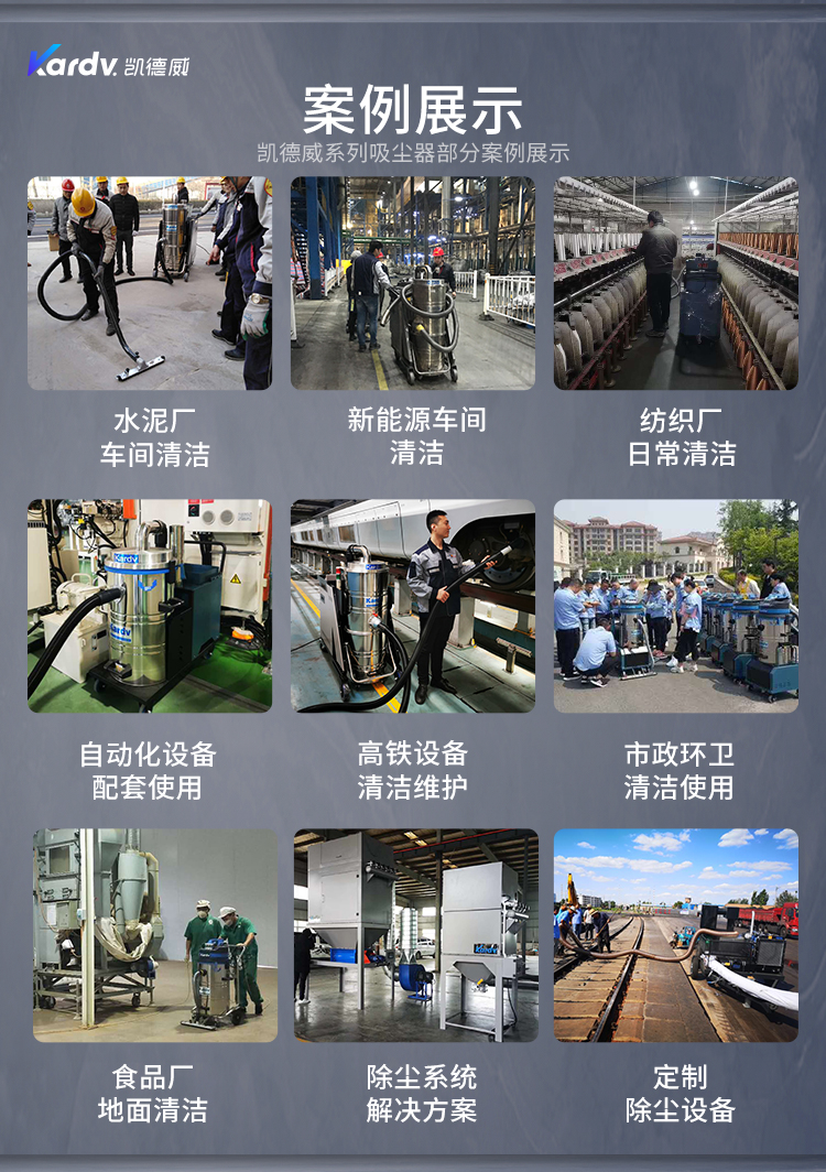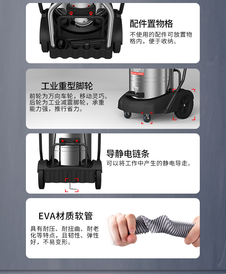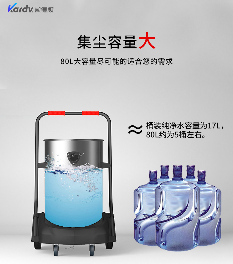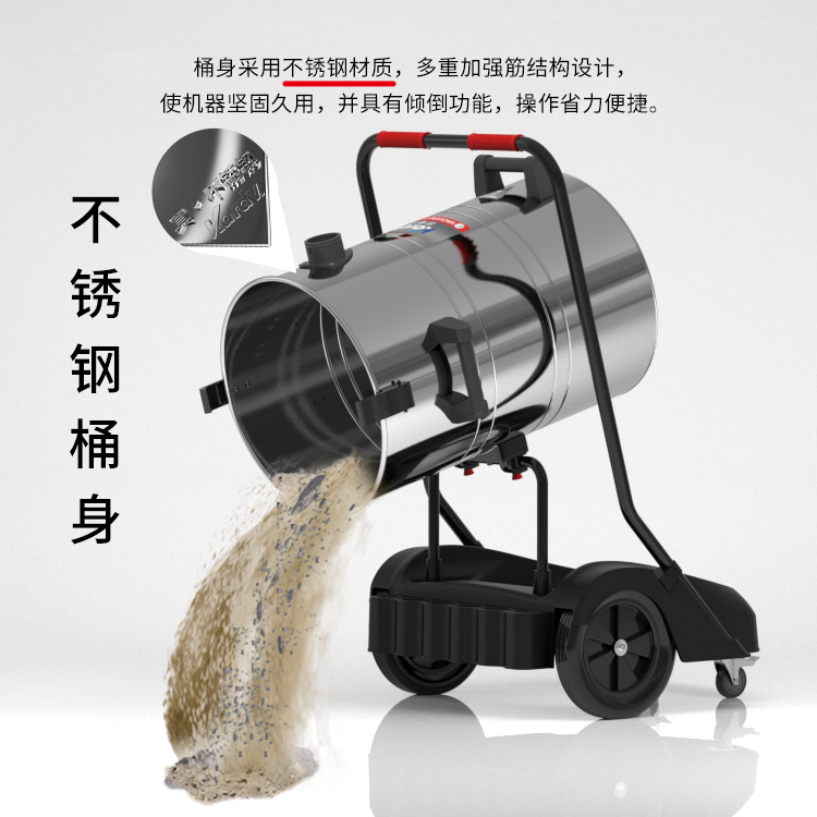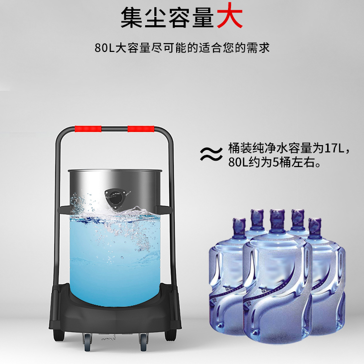 GS-2078S是一款工業(yè)型吸塵器,集塵桶為80L,為不銹鋼材質(zhì),配有車架,在移動時輕巧方便,車架底座為PP材質(zhì),底座上有置物格,可放置配件或工具方便收納和使用;可以用在工廠、倉庫或建筑工地等場所清理灰塵等,在商業(yè)環(huán)境中也可以使用。