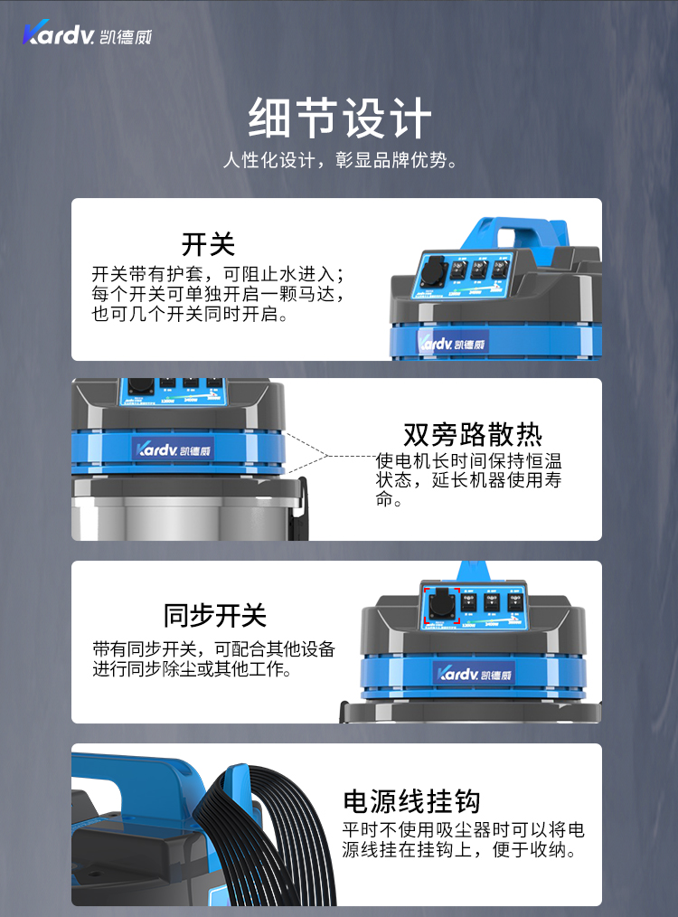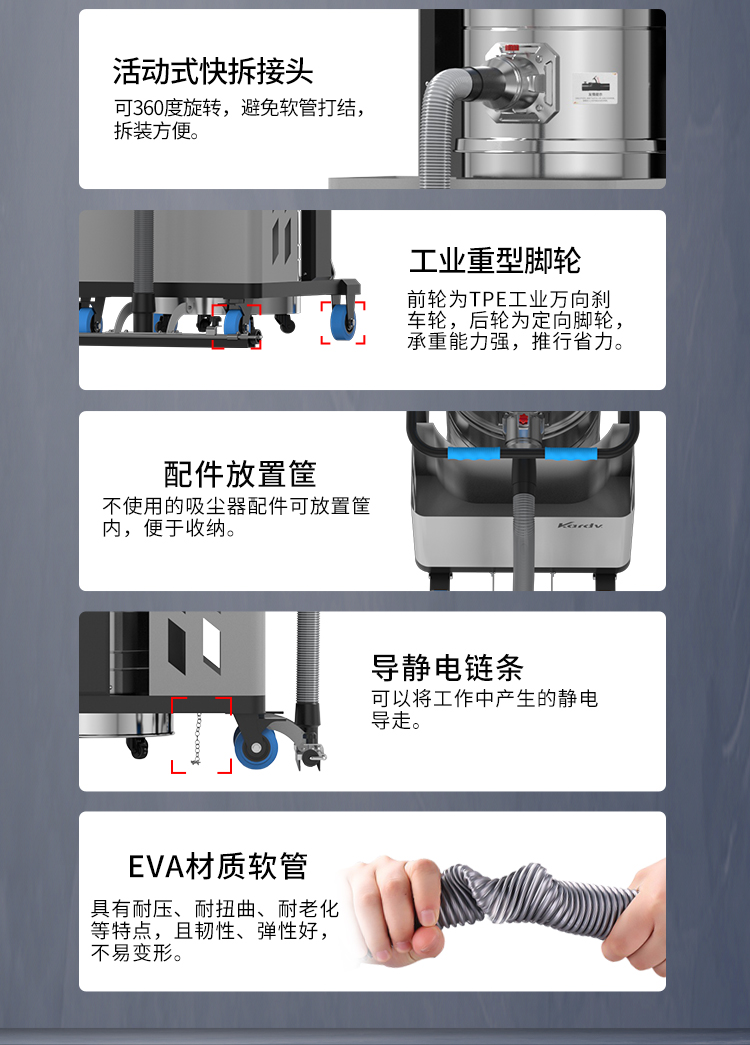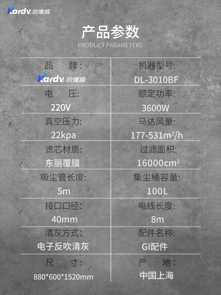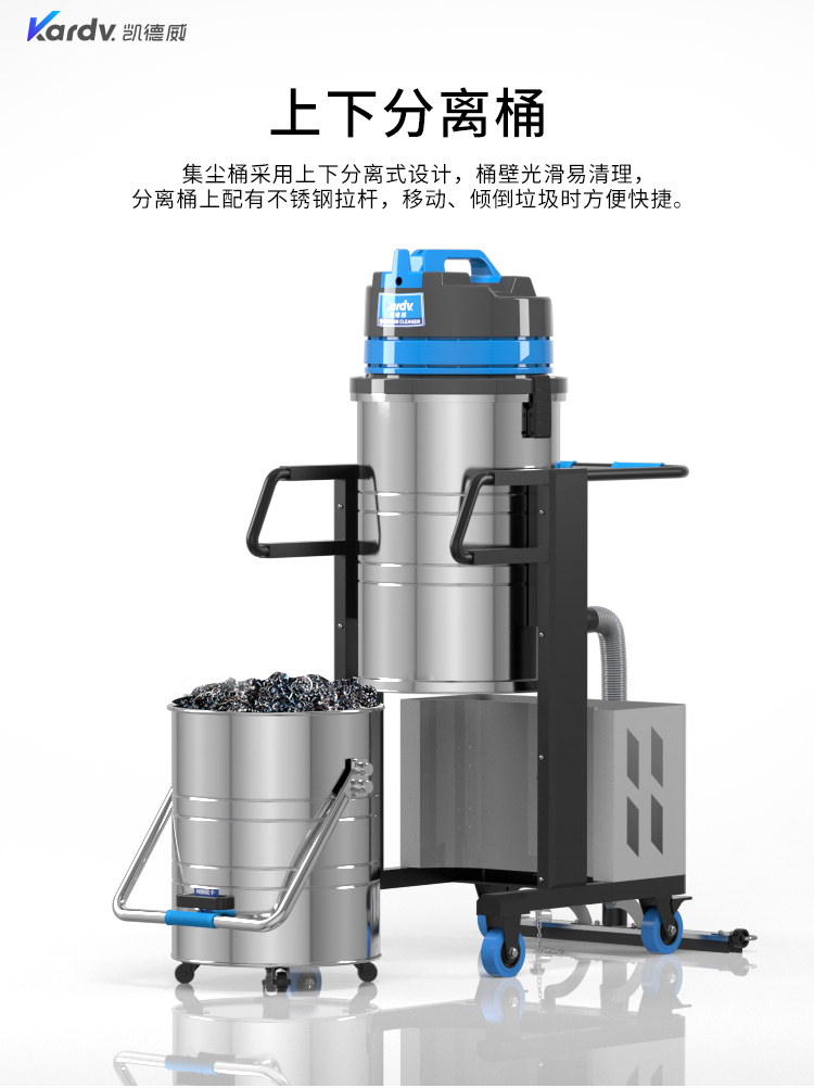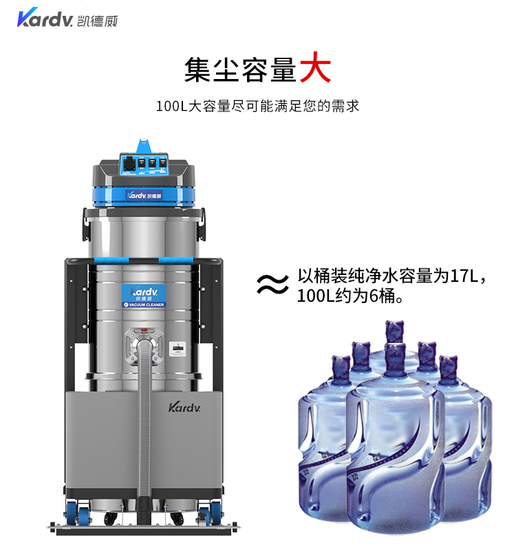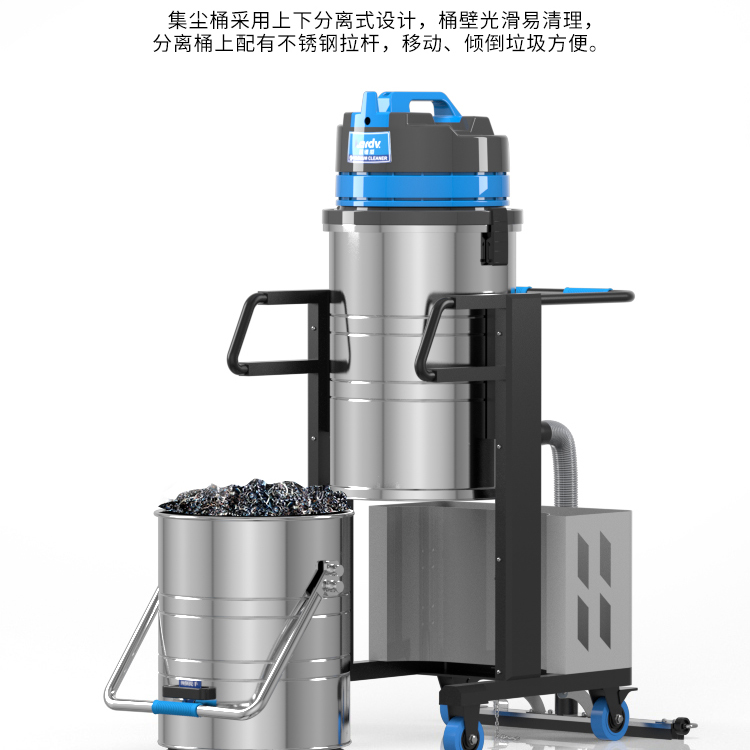 DL-3010BF是一款干濕兩用型工商業(yè)吸塵器,電壓220v,有3顆馬達(dá)組成,每個(gè)馬達(dá)1200w功率,合計(jì)功率360W,帶一套40口徑GI配件和一套60公分寬的推吸扒頭,工作直徑32米左右??筛鶕?jù)不同工況選擇單獨(dú)開一個(gè)電機(jī)或兩個(gè)/三個(gè)同時(shí)開,100L不銹鋼集塵桶采用上下分離式設(shè)計(jì),桶壁光滑易清理,分離桶上配有不銹鋼拉桿,移動(dòng)、傾倒垃圾時(shí)方便;配有反吹清灰裝置,當(dāng)吸力不足時(shí),可按下反吹手柄幾秒進(jìn)行反吹清理。機(jī)器配有置物框,便于收納配件。機(jī)器可以邊推邊吸。適用于五金、食品、電機(jī)、機(jī)械、化工等工商