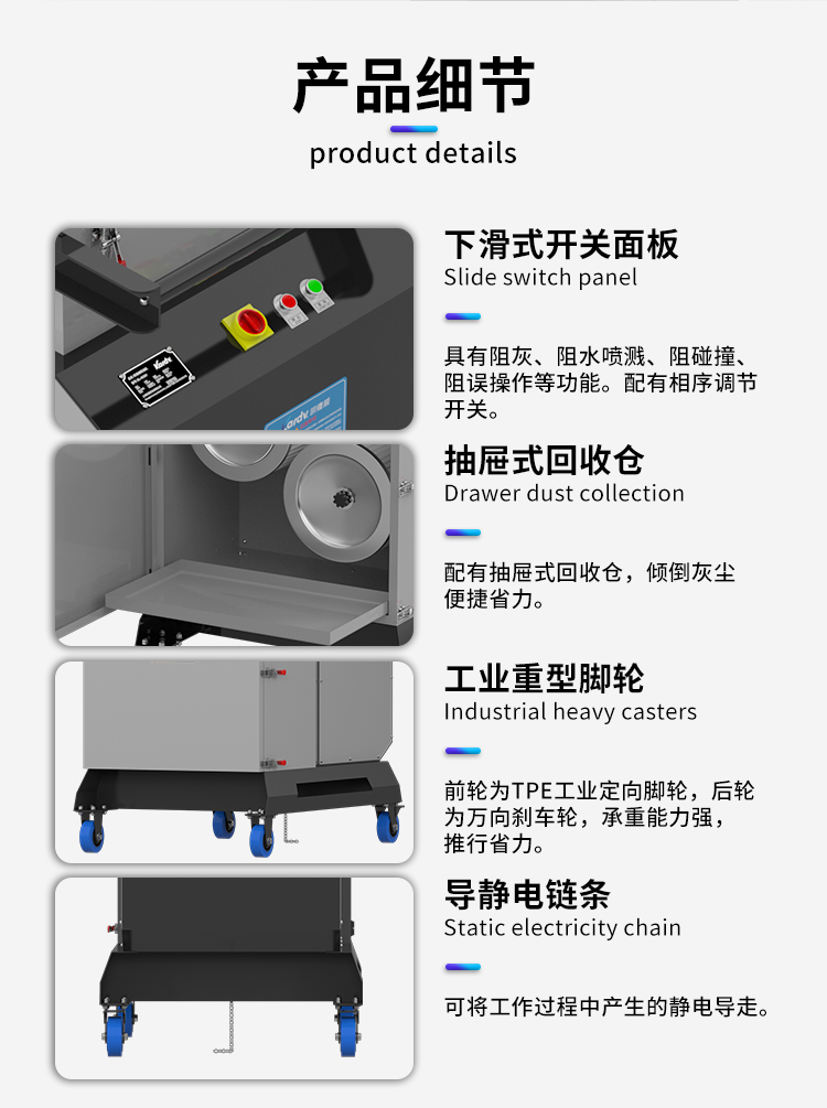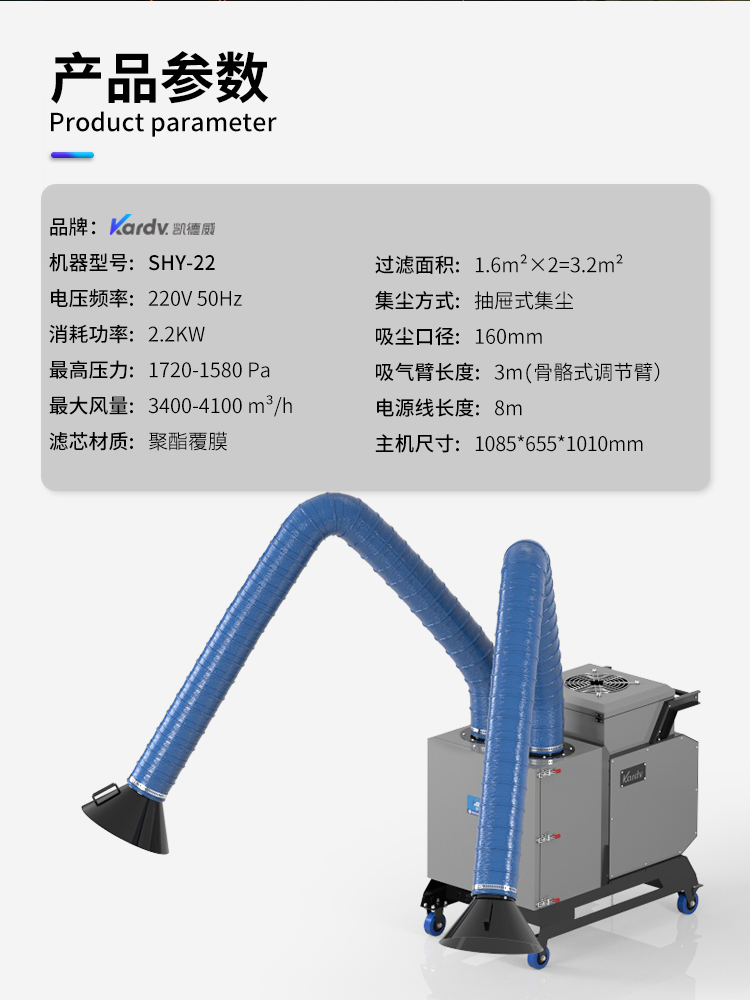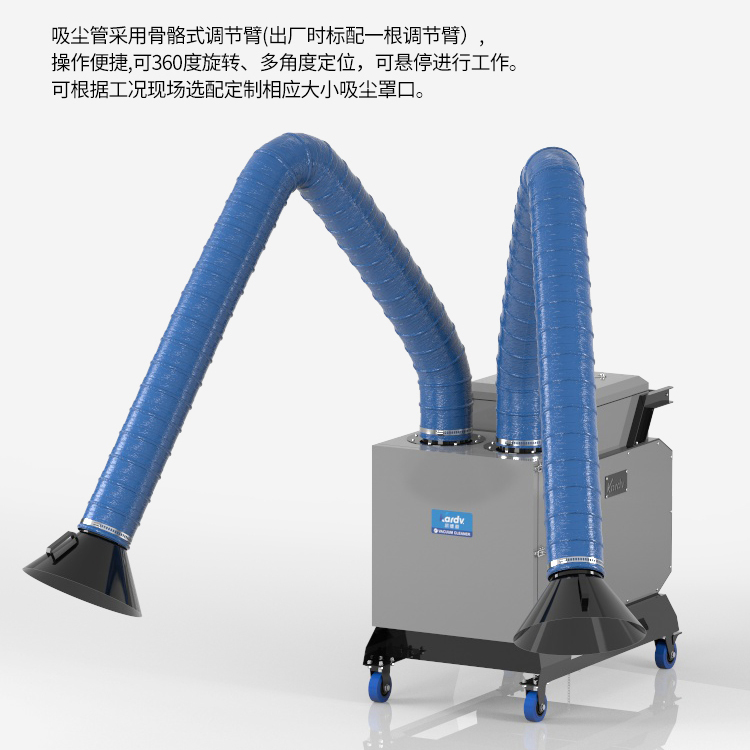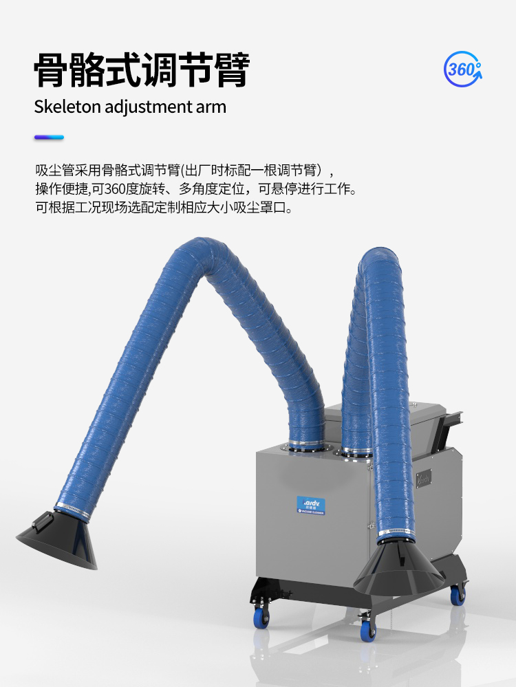 金屬焊接、激光切割、打磨作業(yè)時,大量煙塵懸浮在車間內(nèi),被吸入人體肺部影響身體健康,因此在焊接煙塵進入焊工呼吸區(qū)前把這些煙塵進行凈化處理。凱德威移動式焊接煙塵凈化器是一款治理焊接、切割、打磨時,產(chǎn)生在空氣中大量懸浮危害人體的細小煙塵顆粒而設(shè)計的凈化裝置,可移動式單機處理或多工位系統(tǒng)集中式處理。配有1根2.5米長的吸氣臂,在不同的工作地點移動靈活,操作方便。